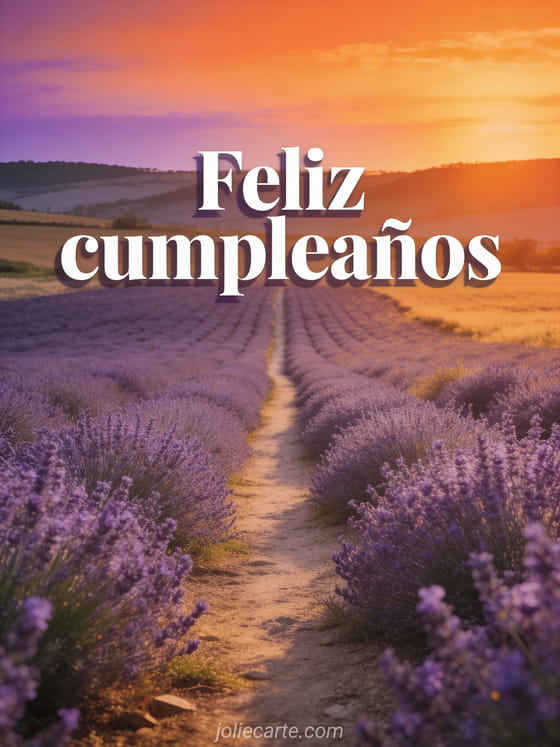 Envia esta hermosa tarjeta de feliz cumpleaños con un impresionante paisaje de campo al atardecer, un camino bordeado de campos de lavanda bajo un cielo anaranjado y violeta. Descubre tambien una tarjeta de cumpleaños con auto vintage o una tarjeta de cumpleaños para grupo.