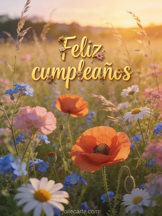 Celebra un cumpleaños especial con esta hermosa tarjeta con un campo de flores silvestres al atardecer. Descubre también una imagen gratis de cumpleaños o una tarjeta con frases de cumpleaños.