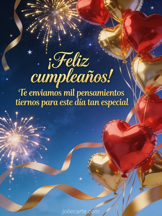 Celebra un cumpleaños con esta magnífica tarjeta gratuita. Globos en forma de corazón rojo y oro con cintas elegantes, fuegos artificiales dorados iluminando un cielo azul noche estrellado, en una atmósfera festiva y majestuosa.