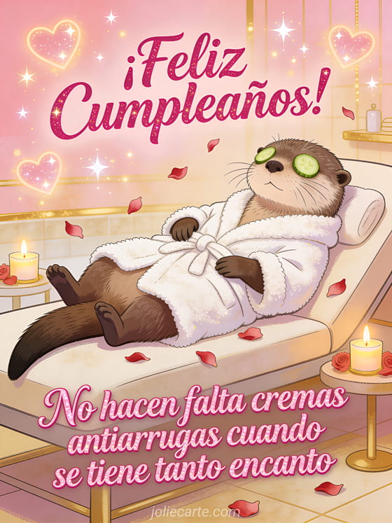 Envía esta divertida tarjeta de cumpleaños con una adorable nutria en bata de spa con rodajas de pepino en los ojos. Descubre también una tarjeta cumpleaños con gato divertido o una tarjeta cumpleaños humor mujer.