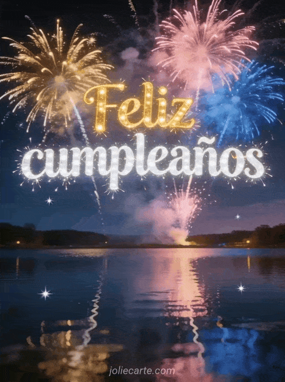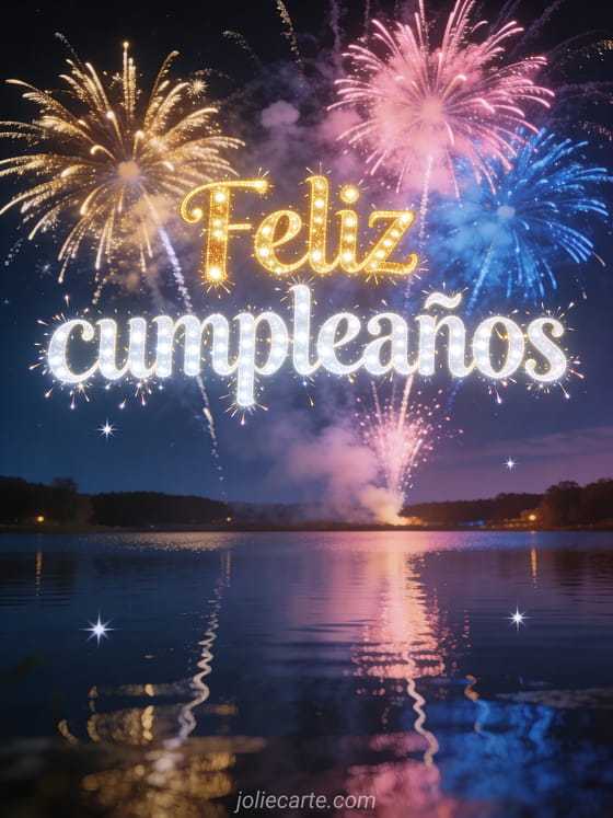 Celebra un cumpleaños con esta impresionante tarjeta con letras doradas centelleantes, magníficos fuegos artificiales multicolores que estallan sobre un lago tranquilo bajo un cielo estrellado. Descubre también una tarjeta de cumpleaños con nutria o una tarjeta de cumpleaños minimalista.