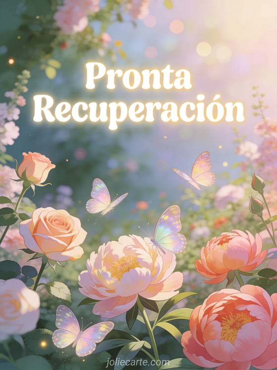 Envia esta hermosa tarjeta de recuperacion con un jardin primaveral en plena floracion con rosas, peonias y mariposas iridiscentes para desear una pronta recuperacion. Descubre tambien una tarjeta de recuperacion o una tarjeta de pronta recuperacion o una tarjeta de recuperacion mi amor.