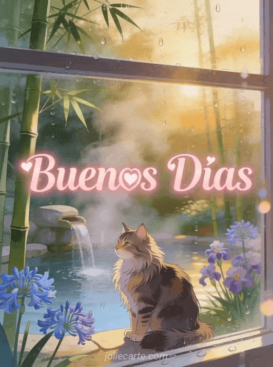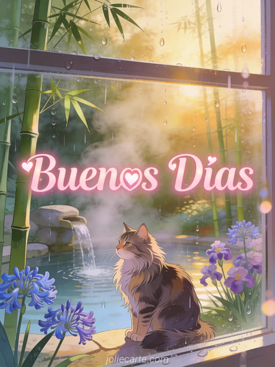 Envía un tierno saludo de Buenos Días con un majestuoso gato Maine Coon junto a una fuente termal rodeado de agapantos. Descubre también una tarjeta Buenos Días con flores o una tarjeta Buenos Días.