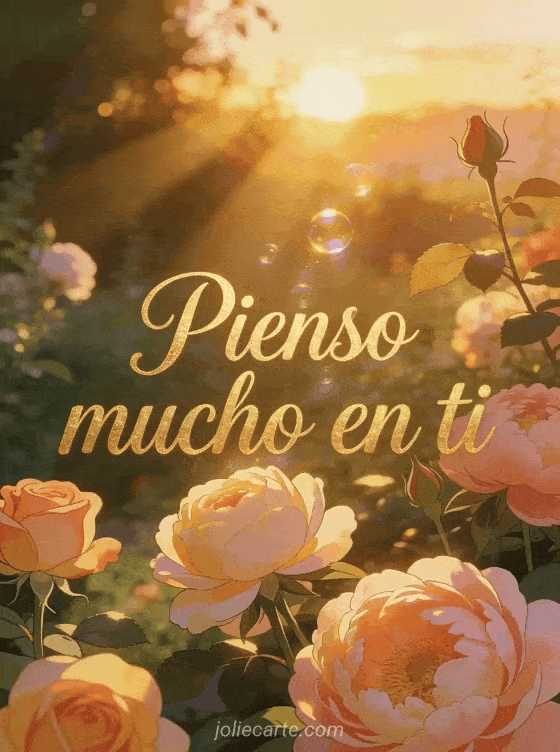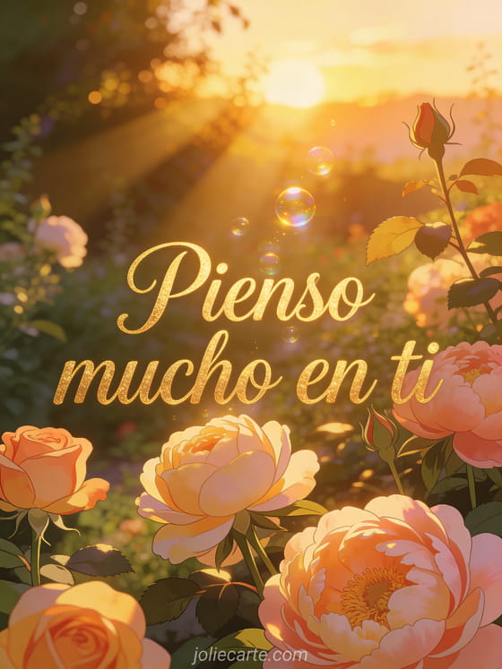 Envía un sincero saludo de pienso en ti con rosas y peonías en un jardín dorado al atardecer. Descubre también un gif animado pienso en ti o una tarjeta pienso en ti con gato.