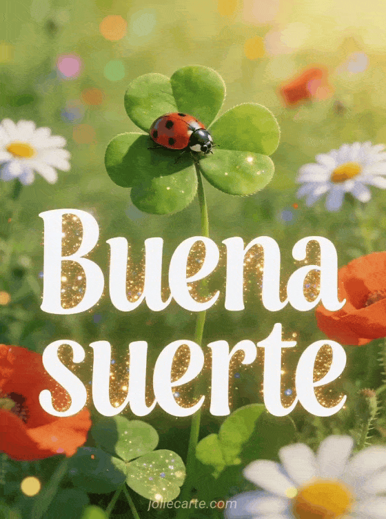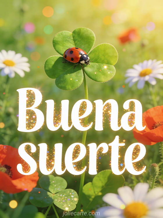 Desea buena suerte a alguien con esta alegre tarjeta. Una mariquita descansa sobre un brillante trébol de cuatro hojas verde en una pradera florida llena de margaritas y amapolas, con cálida luz veraniega y bokeh colorido.