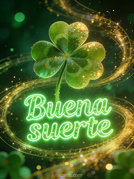 Desea buena suerte a alguien con esta mágica tarjeta. Un trébol de cuatro hojas gigante brilla con purpurina dorada arremolinándose, sobre un fondo verde esmeralda profundo con puntos luminosos, creando una atmósfera mágica de buena suerte.