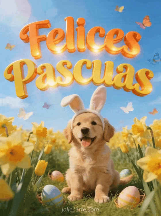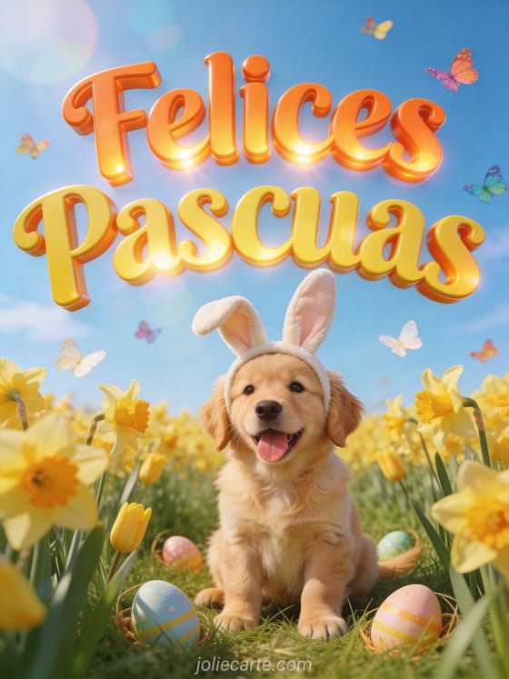 Comparte este adorable saludo de Pascua con un cachorro golden retriever con orejas de conejo sentado en un campo de narcisos con huevos de Pascua escondidos en la hierba y mariposas coloridas. Descubre tambien una tarjeta gif de conejo de Pascua.
