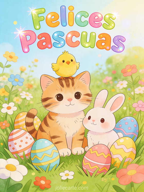 Comparte este alegre saludo de Pascua con animales adorables en un jardin de Pascua: un pollito sobre la cabeza de un gatito atigrado, un conejito al lado, rodeados de huevos decorados en la hierba florida. Descubre tambien una tarjeta video de conejo de Pascua o una tarjeta gif de conejo de Pascua.