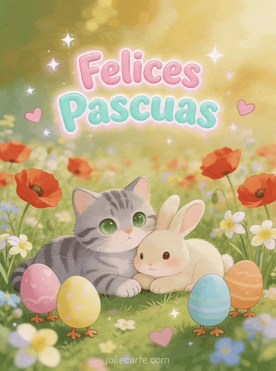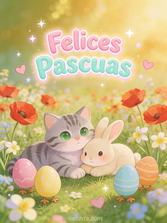 Alegra a los más pequeños con esta adorable tarjeta de Felices Pascuas con un gatito atigrado y un conejito acurrucados en un campo de amapolas y margaritas, rodeados de huevos de Pascua coloridos. Una ilustración kawaii llena de alegría y ternura. Descubre también una tarjeta de animales de Pascua o una tarjeta con video del conejito de Pascua.