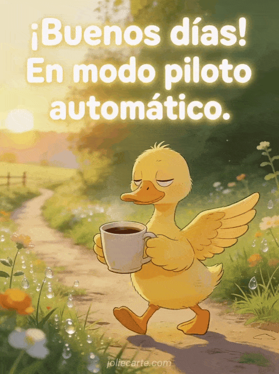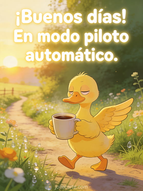Empieza el día con una sonrisa enviando esta divertida tarjeta de buenos días. Un pato amarillo camina medio dormido con una enorme taza de café, capturando perfectamente el modo piloto automático mañanero. Descubre también una tarjeta graciosa de café por la mañana o una tarjeta de buenos días con humor.