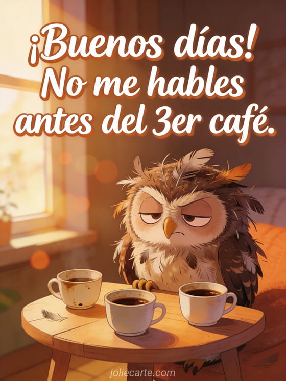 Empieza el día con una carcajada enviando esta tarjeta de buenos días con humor. Un búho despeinado y de mal humor está sentado frente a tres tazas de café vacías, capturando perfectamente el estado pre-cafeína. Descubre también una tarjeta graciosa de buenos días.