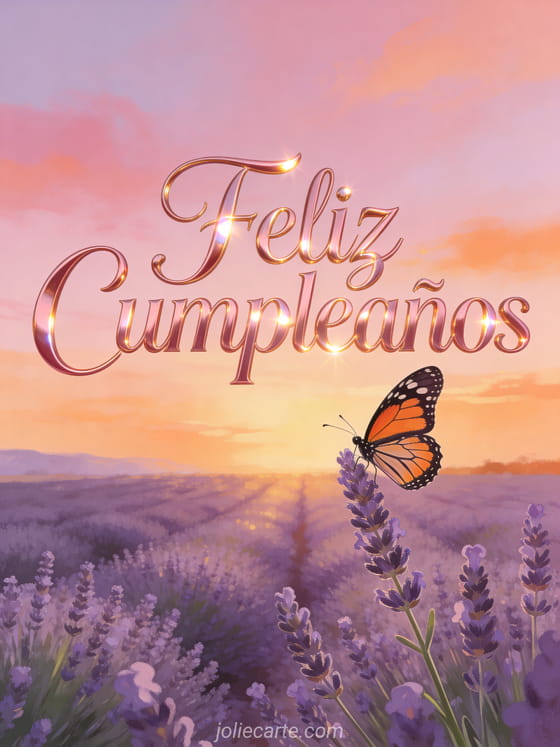 Deséale un feliz cumpleaños con esta poética tarjeta con un campo de lavanda al atardecer dorado con una mariposa monarca posada en un tallo. Descubre también una tarjeta de cumpleaños con corazón de rosas o una tarjeta de cumpleaños con tulipanes.
