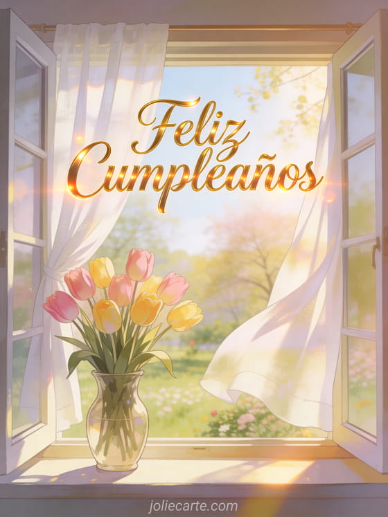 Deséale un feliz cumpleaños con esta relajante tarjeta con un jarrón de tulipanes en el alféizar de una ventana con cortinas blancas de voile y un paisaje primaveral bañado en luz dorada. Descubre también una tarjeta elegante de cumpleaños con champagne o una tarjeta de cumpleaños con mariposa.