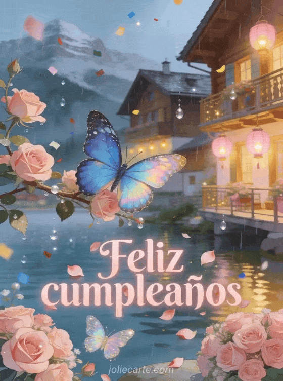 Celebra un cumpleaños con esta tierna tarjeta que muestra una mariposa morpho azul posada en una rama florecida junto a un lago alpino suizo con chalets de madera bajo una lluvia suave, rosas rosadas, confeti de colores y faroles rosados. Descubre también una tarjeta de cumpleaños de cuento de hadas o una tarjeta de cumpleaños en la arena.