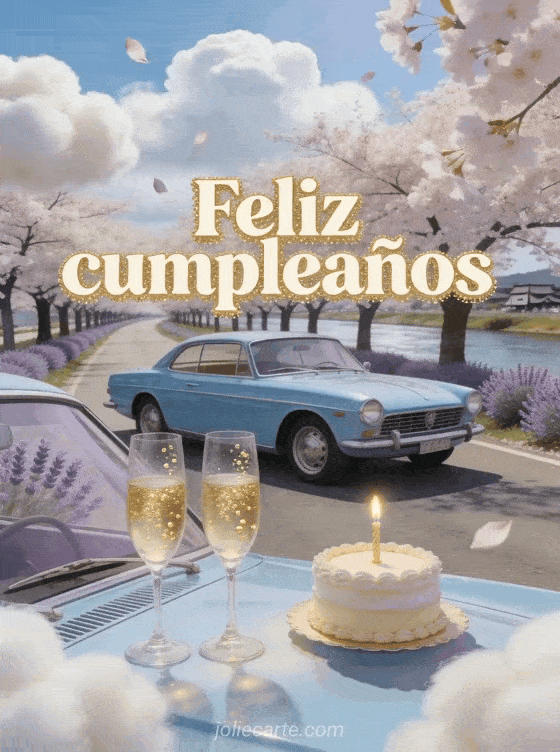Feliz cumpleaños un auto antiguo bajo cerezos en flor junto al río