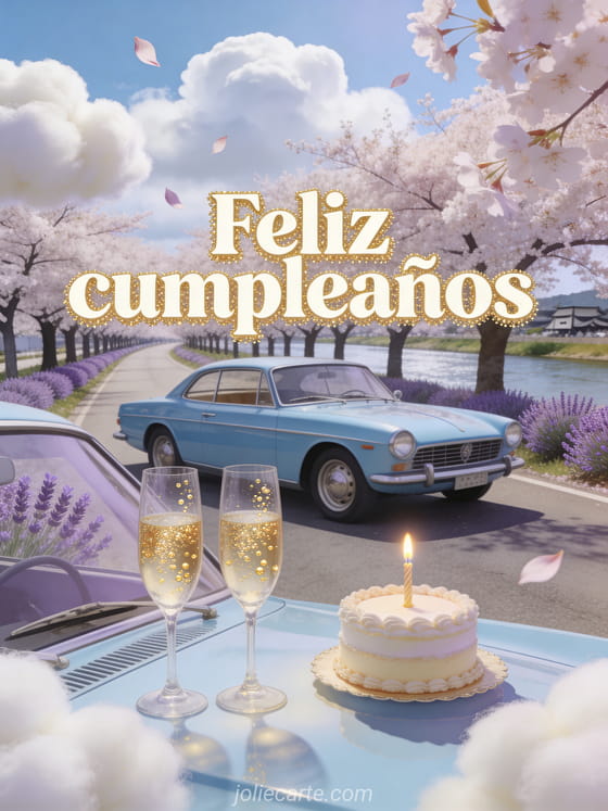 Celebra un cumpleaños con esta encantadora tarjeta retro que muestra un auto antiguo azul pastel estacionado bajo cerezos en flor junto a un río en Japón, con copas de champán y un pastel de cumpleaños. Descubre también una tarjeta de cumpleaños con faro o una tarjeta de cumpleaños con mariposa.