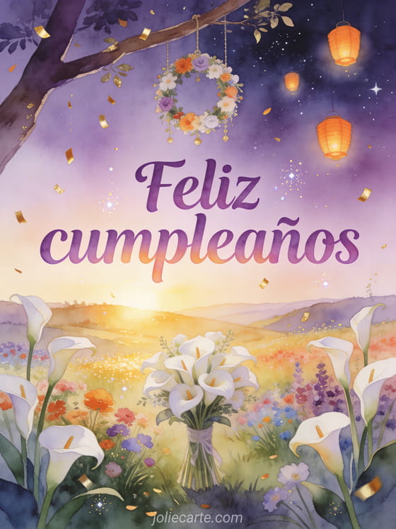 Celebra un cumpleaños con esta tarjeta soñadora con un valle florido al amanecer dorado con elegantes calas, una corona de flores festiva, confeti dorado y linternas naranjas flotando en un cielo estrellado. Descubre también una tarjeta animada de cumpleaños para él o una tarjeta de cumpleaños para él.