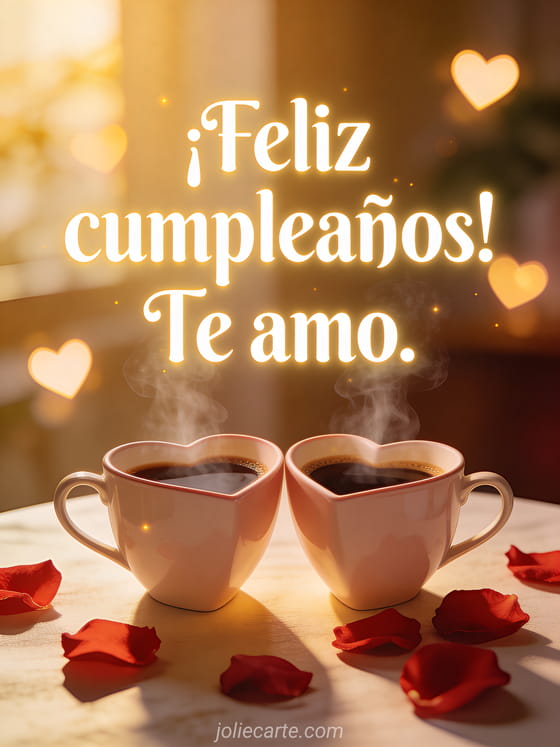 Celebra el cumpleaños de tu ser querido con esta romántica tarjeta con dos tazas de café humeantes en forma de corazón una al lado de la otra con pétalos de rosa roja, cálida luz dorada matutina y luces centelleantes en forma de corazón. Descubre también una tarjeta de cumpleaños para él o una tarjeta animada de cumpleaños para él.