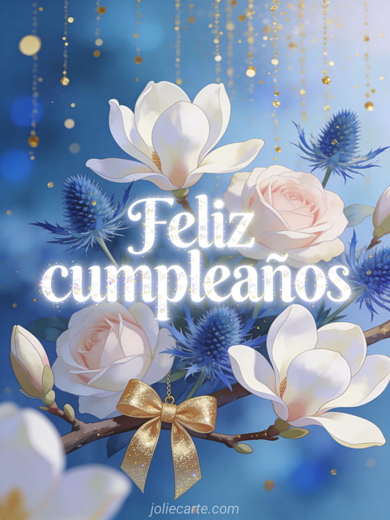 Celebra un cumpleaños con esta elegante tarjeta con magnolias blancas y rosas con cardos azules, destellos dorados cayendo del cielo y un moño dorado colgado de una rama de magnolia. Descubre también una tarjeta de cumpleaños para hombre o una elegante tarjeta de cumpleaños.