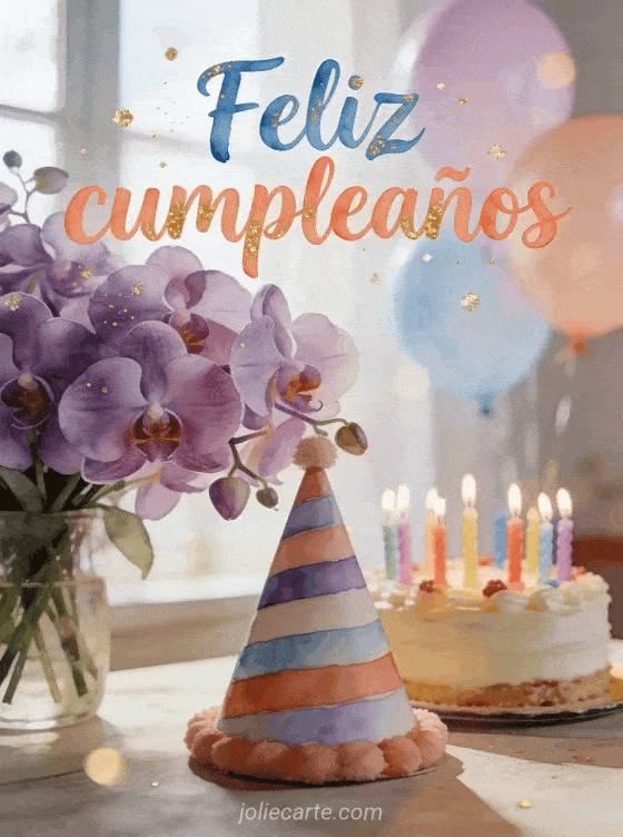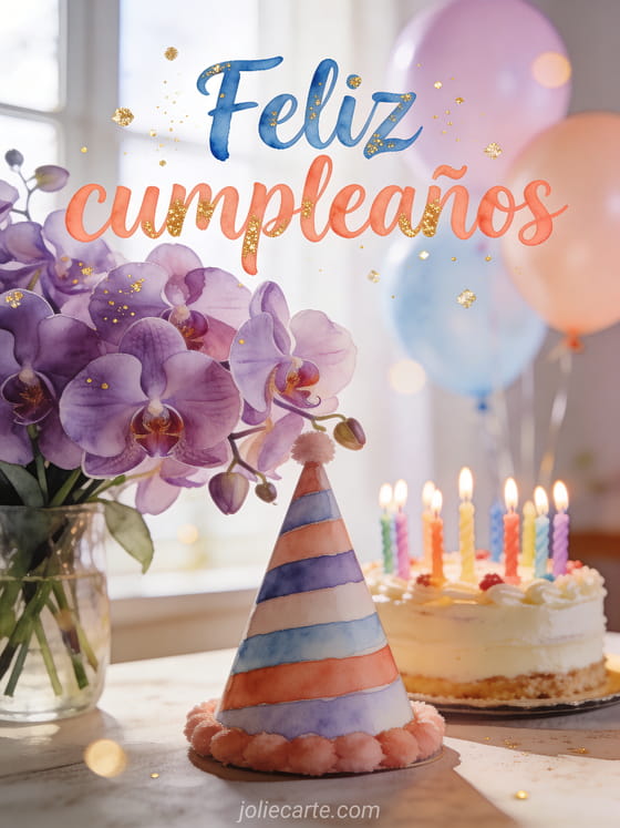 Celebra un cumpleaños con esta hermosa tarjeta fotorrealista con un magnífico ramo de orquídeas moradas con un sombrero de fiesta rayado, un pastel decorado con velas coloridas y globos pastel con luz natural suave. Descubre también una tarjeta de cumpleaños para niña o una tarjeta de cumpleaños para niños.