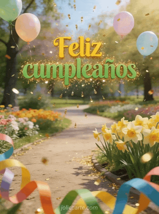 Celebra un cumpleaños con esta alegre tarjeta primaveral con un parque de narcisos en flor, globos pastel flotando en el aire y destellos dorados cayendo del cielo. Descubre también una tarjeta de cumpleaños para niños o una tarjeta de cumpleaños para niños.