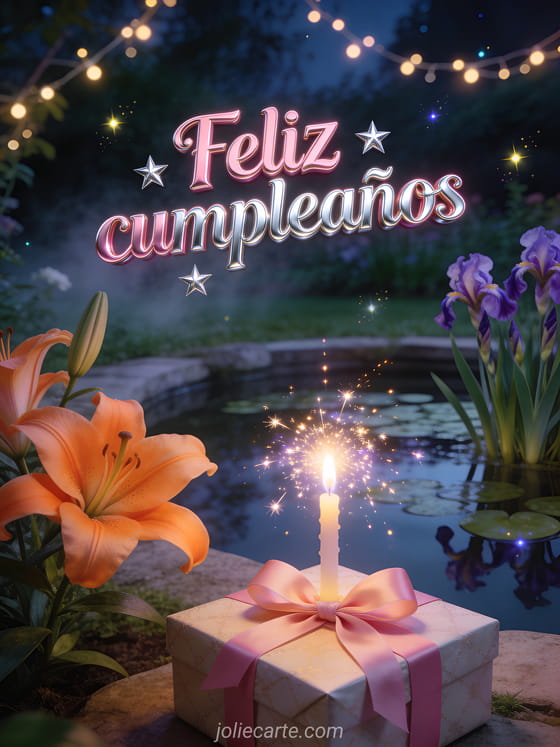 Celebra un cumpleaños con esta encantadora tarjeta de cuento de hadas con suntuosos lirios naranjas junto a un estanque con iris de agua, luciérnagas centelleantes y guirnaldas luminosas en una noche mágica. Descubre también una tarjeta de cumpleaños para niños o una tarjeta animada de cumpleaños.