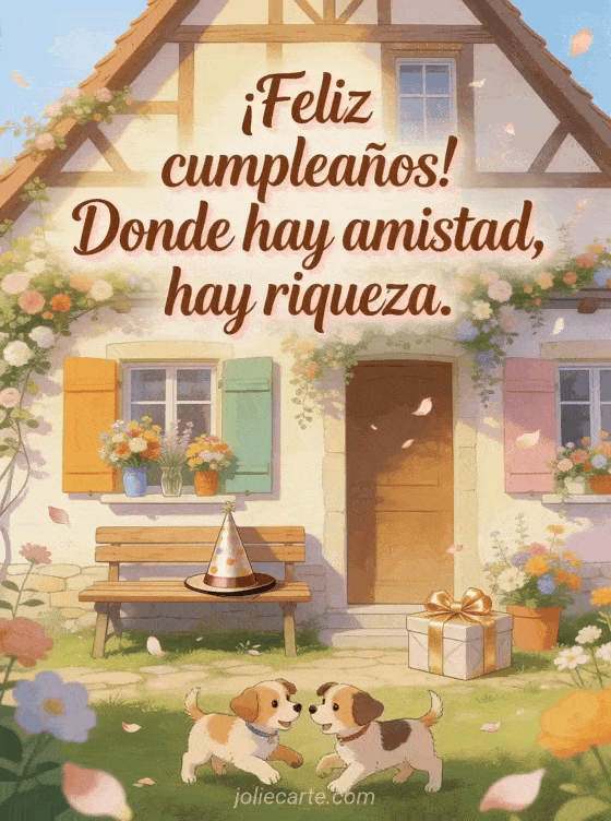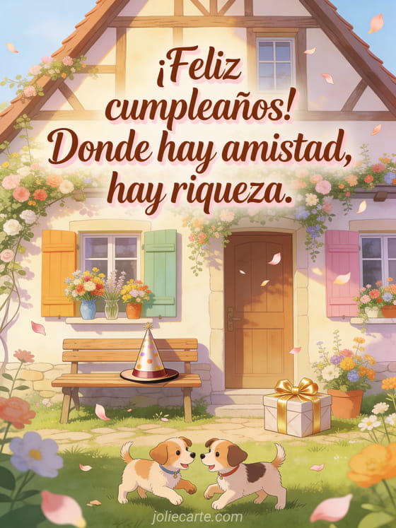 Celebra la amistad en un cumpleaños especial con esta encantadora tarjeta con una casa con entramado de madera con flores silvestres y dos cachorros jugando en el jardín. Descubre también una tarjeta de cumpleaños para amiga o un mensaje de cumpleaños para amigo.