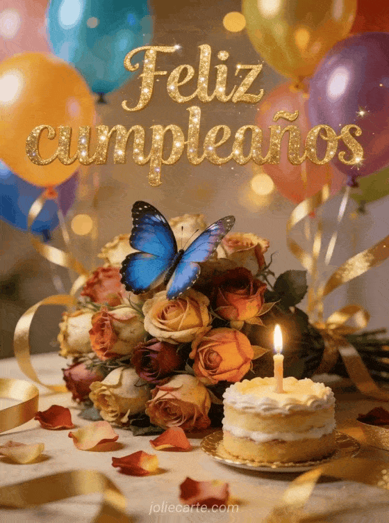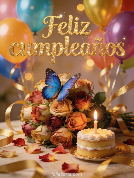 Ilumina el cumpleaños de alguien especial con esta encantadora tarjeta con una adorable mariposa morpho azul posada sobre un ramo de rosas antiguas rodeada de globos coloridos. Descubre también un mensaje de cumpleaños para amigo o una tarjeta de cumpleaños para amiga.