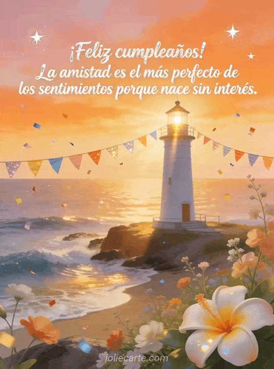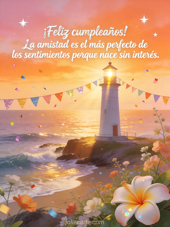 Envía esta poética tarjeta de cumpleaños de amistad con un faro en la costa al atardecer con flores silvestres y flor de tiaré en primer plano, banderines coloridos y confeti en el aire marino. Descubre también una tarjeta de cumpleaños para amigo o una tarjeta de cumpleaños divertida para amigo.