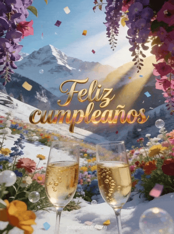 Celebra el cumpleaños de tu hija con esta impresionante tarjeta gratuita con un valle alpino cubierto de flores silvestres coloridas, buganvilla, champán y confeti bajo luz dorada. Descubre también una tarjeta de feliz cumpleaños para mi hija o una tarjeta de cumpleaños con unicornio.