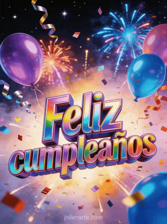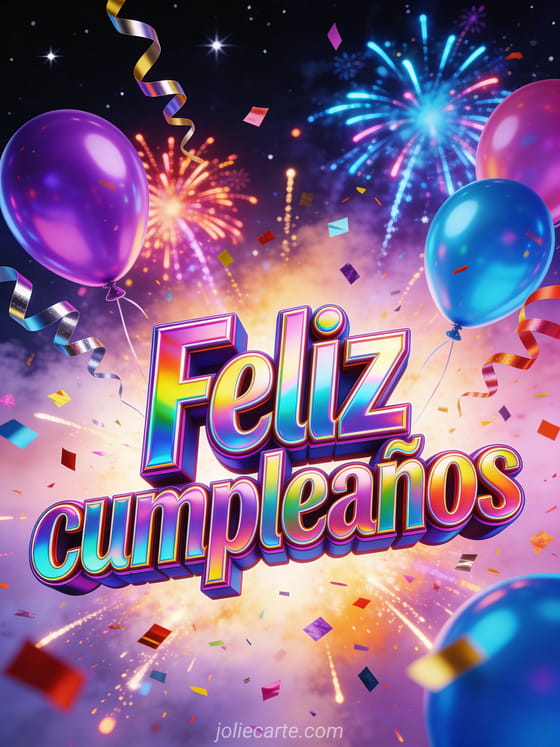 Celebra con esta energética tarjeta de cumpleaños con letras 3D holográficas multicolores, una explosión de confeti metálico y serpentinas en un cielo nocturno estrellado con fuegos artificiales coloridos y globos violeta neón y azul eléctrico. Descubre también un gif de cumpleaños para adolescente o una tarjeta de cumpleaños con texto para adolescentes.
