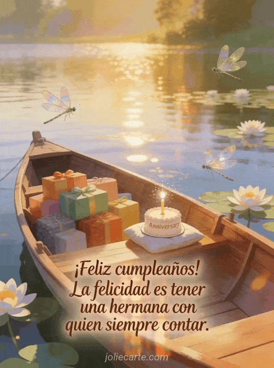 Celebra el cumpleaños de tu hermana con esta poética tarjeta que muestra una barca de madera en un lago tranquilo con nenúfares, regalos coloridos y un elegante pastel con vela brillante bajo la luz dorada de la mañana. Descubre también una tarjeta de cumpleaños para hermana o una tarjeta de cumpleaños para una hermana.