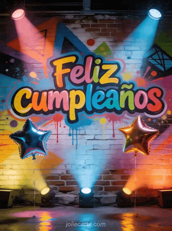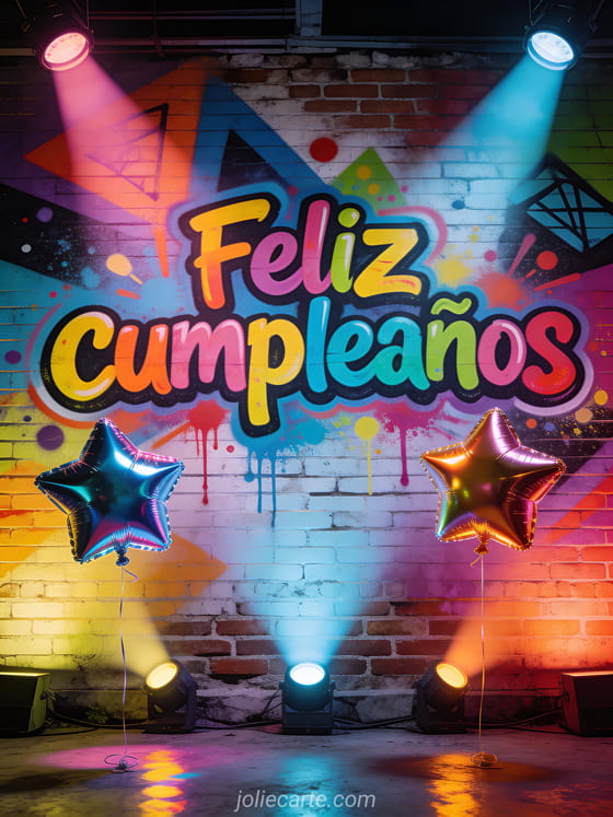 Sorprende con esta tarjeta de cumpleaños estilo graffiti sobre un muro de ladrillos con arte urbano vibrante, globos metálicos en forma de estrella y proyectores coloridos. Descubre también una tarjeta de cumpleaños para adolescentes o una tarjeta de cumpleaños para chica joven.