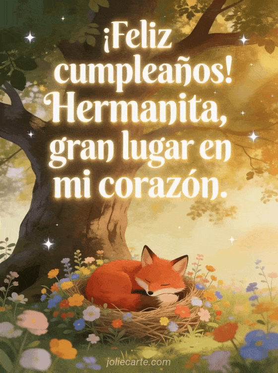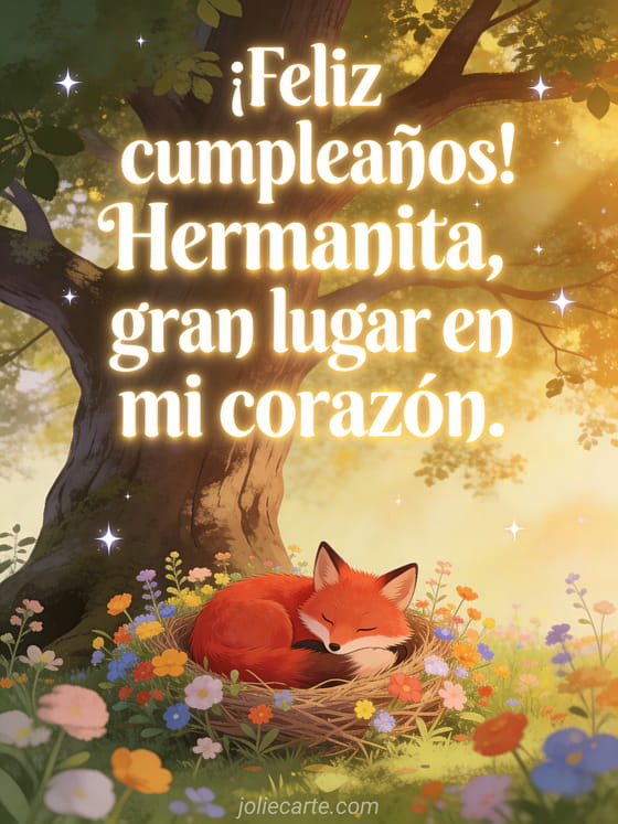 Celebra el cumpleaños de tu hermanita con esta tierna tarjeta con un adorable zorro rojo acurrucado entre flores silvestres primaverales coloridas al pie de un gran roble, luz dorada filtrada y estrellas centelleantes. Descubre también una tarjeta gif de cumpleaños hermana mayor o una tarjeta de feliz cumpleaños hermanita.