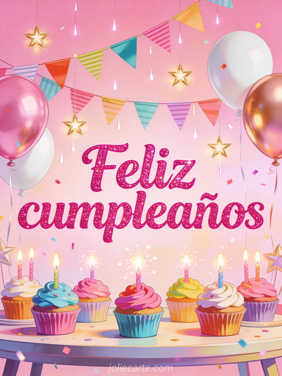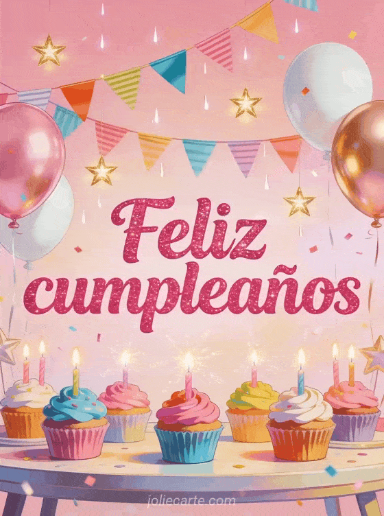 Celebra un cumpleaños con esta vibrante tarjeta con una mesa festiva cubierta de cupcakes coloridos con glaseados vivos, velas brillantes, guirnaldas de banderines multicolor, globos rose gold y estrellas doradas sobre un fondo rosa pastel. Descubre también una tarjeta de cumpleaños chica joven o un gif de cumpleaños adolescente.