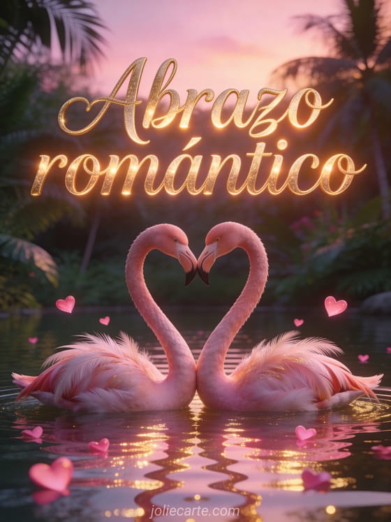 Envía esta romántica tarjeta con las palabras Abrazo romántico escritas en letras doradas cursivas con efecto de luz cálida, con dos flamencos formando un corazón con sus cuellos en un lago al atardecer, con reflejos rosa y dorado en el agua. Descubre también una tarjeta abrazo pareja enamorada dormir o una dulzura imagen abrazo ternura.