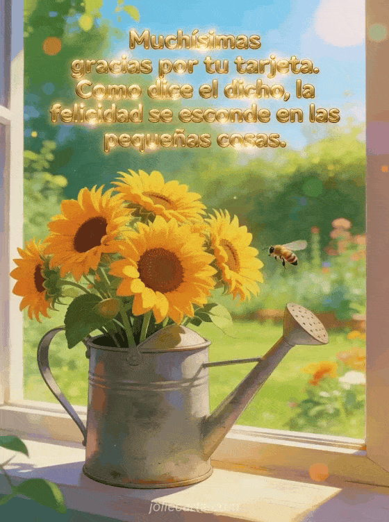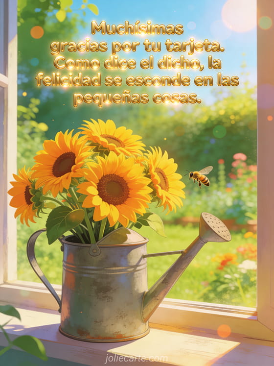 Expresa tu sincero agradecimiento con esta alegre tarjeta con un ramo de girasoles resplandecientes en una regadera de zinc sobre el alféizar de una ventana con vista a un jardín bañado de sol. Descubre también una tu tarjeta me conmovió mucho o una tarjeta para responder a una tarjeta recibida.