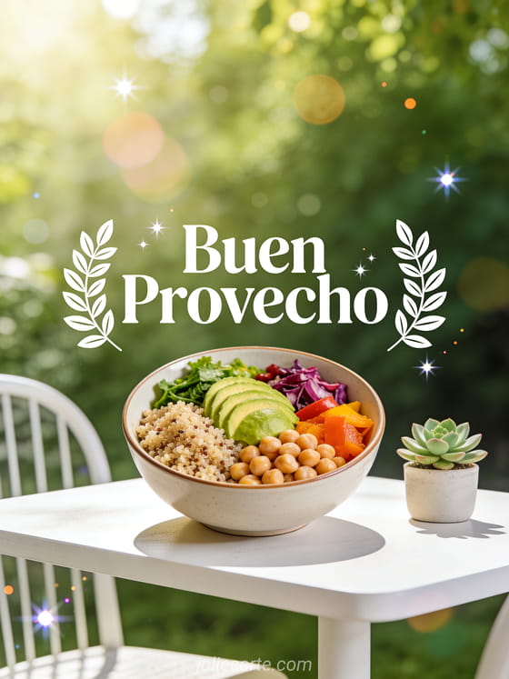 Comparte un delicioso saludo de buen provecho con esta fresca tarjeta de buddha bowl saludable. Descubre también una tarjeta mensaje buen provecho o una tarjeta buen provecho.