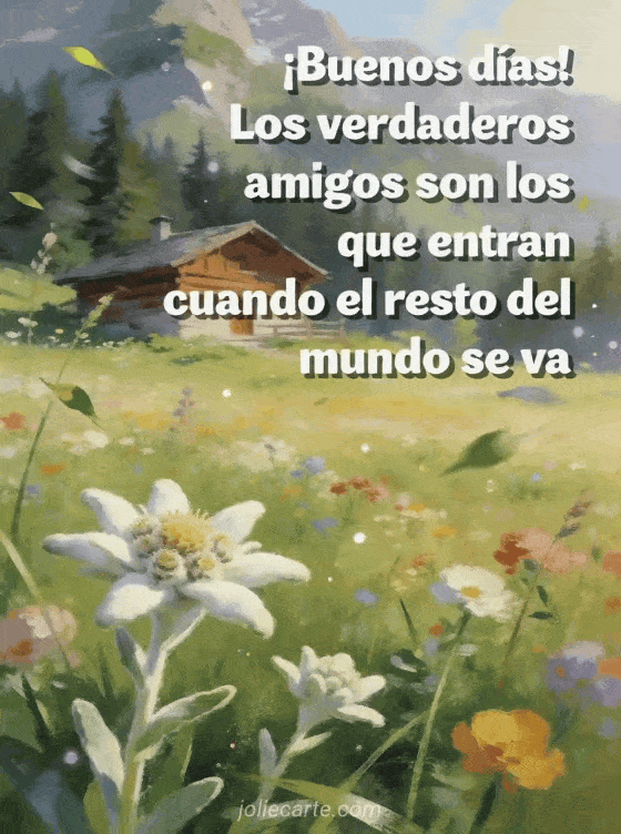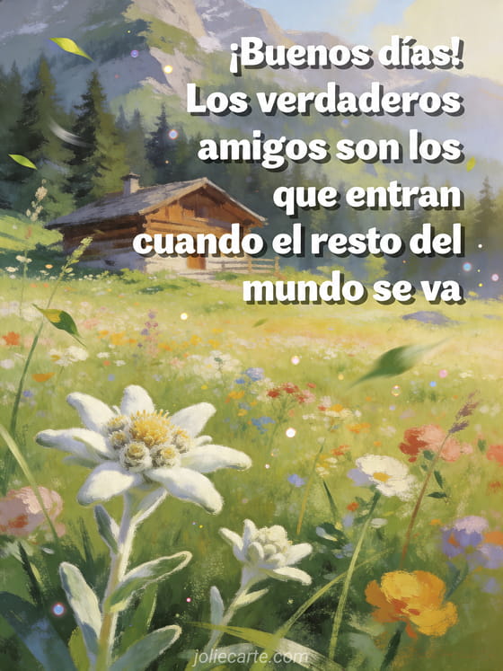 Envía un mensaje de amistad lleno de cariño con esta tarjeta inspiradora que muestra una pradera alpina, un chalet de madera, flores de edelweiss y una suave luz de primavera. También pueden descubrir emilia-romagna tarjeta, hola matinal sms o hola matinal.