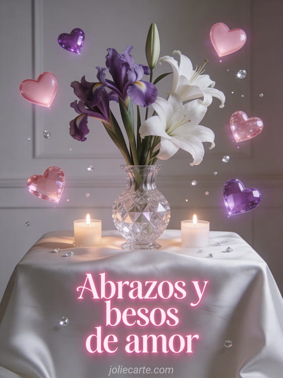 Envía esta romántica tarjeta con las palabras Abrazos y besos de amor escritas en letras rosas con efecto de luz tenue, con iris violetas y lirios blancos en un jarrón de cristal sobre un mantel de seda blanca, con corazones rosas y violetas luminosos flotando con partículas plateadas. Descubre también una imagen de besos de amor o una buenos días besos enamorados.