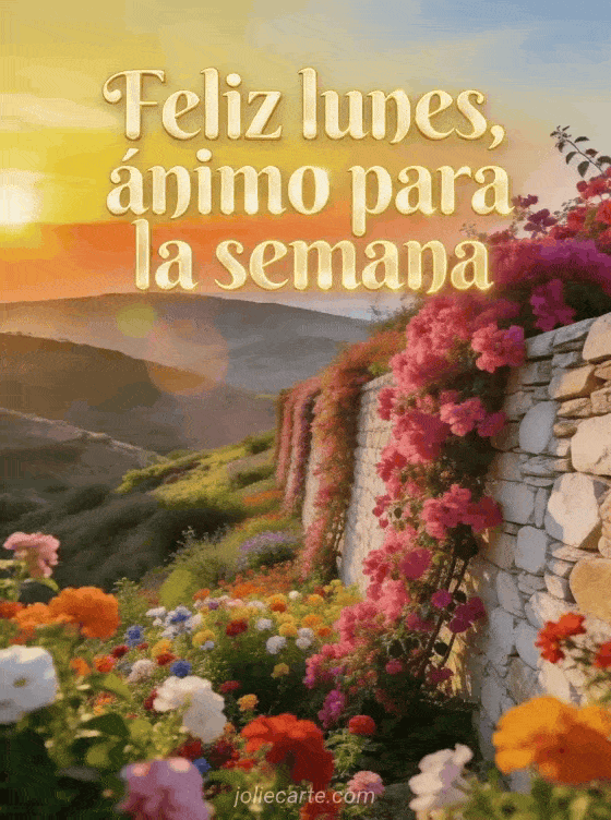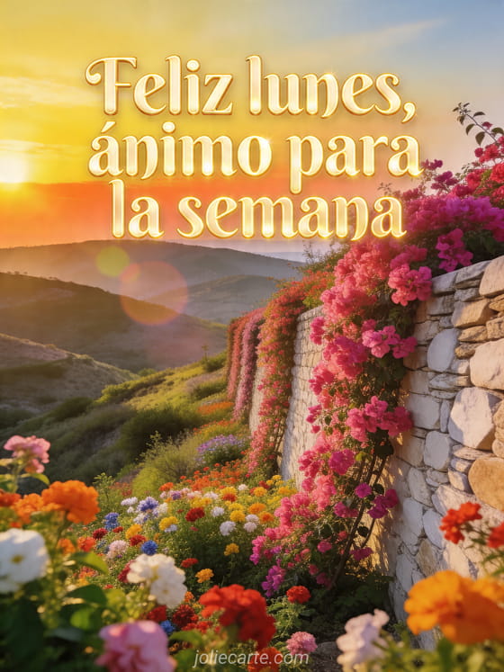 Motiva a alguien para la semana con esta tarjeta luminosa que muestra un valle florido al amanecer dorado, buganvilla cayendo sobre un muro de piedra y colinas panorámicas. También pueden descubrir buenos días lunes divertido, un feliz lunes o buenos días feliz lunes buena semana besos.