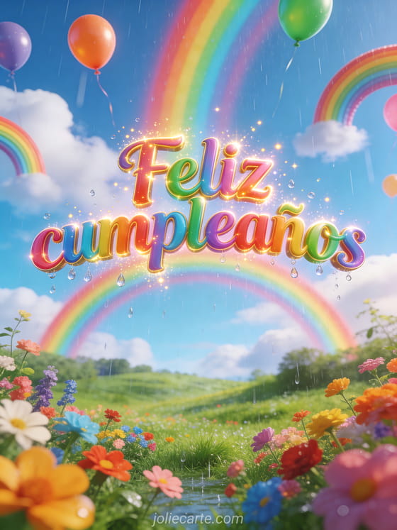 Comparte un deseo brillante de feliz cumpleaños con letras multicolores, un arcoíris completo sobre un paisaje verde después de la lluvia, flores, globos arcoíris, luz dorada y gotas de agua brillantes. También puedes enviar una tarjeta de feliz cumpleaños deseos, una tarjeta de flor feliz cumpleaños o una tarjeta de desear feliz cumpleaños a distancia.