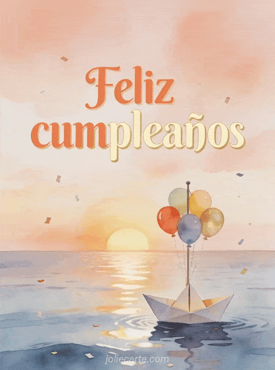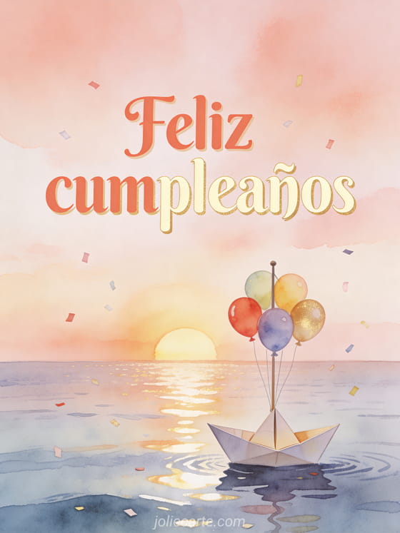 Envíen deseos dulces de cumpleaños para un bebé con una ilustración suave de un barquito de papel navegando en un mar tranquilo, globos de colores atados al mástil, luz de atardecer pastel y confeti flotando como espuma. Descubran también feliz cumpleaños mi bebé 2 años, texto cumpleaños bebé 1 año o feliz cumpleaños bebé.