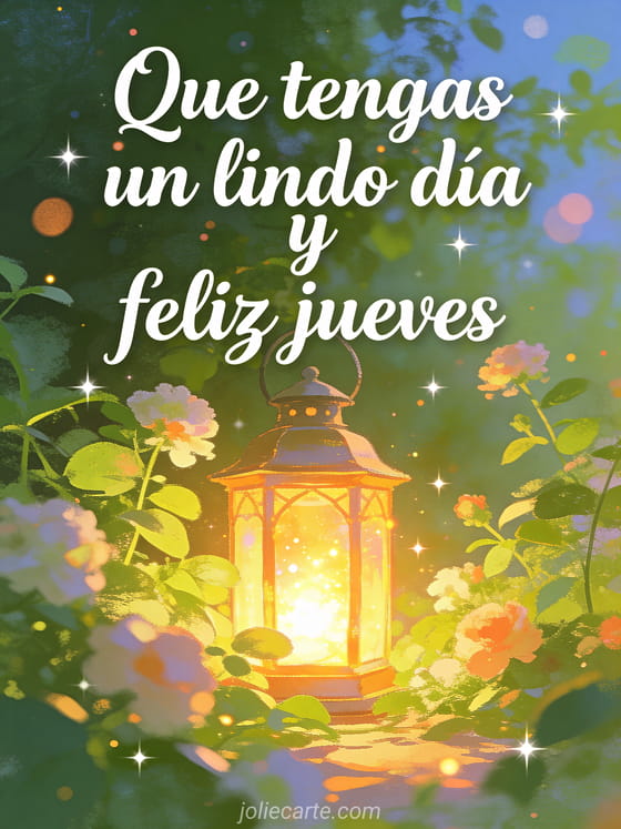 Comparte una bella imagen de feliz jueves con letra cursiva, una linterna luminosa entre vegetación florida y un brillo cálido. También pueden enviar feliz jueves besos gifs animados, jueves buenos días divertido o hermoso día de jueves.