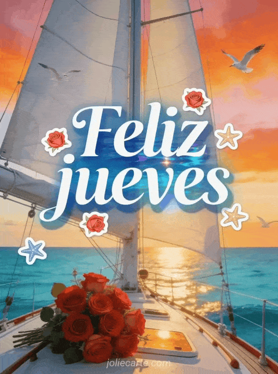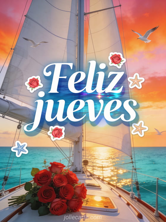 Desea feliz jueves con letras blancas elegantes, reflejos azul océano, rosas rojas, estrellas de mar, un velero blanco sobre aguas turquesas tranquilas, gaviotas y cielo de atardecer. Descubre también feliz jueves cita imágenes, buen día de jueves o buenos días es jueves en imagen.