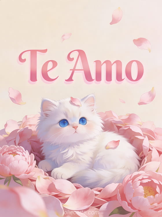 Expresa tu amor con esta adorable tarjeta Te Amo con un gatito persa blanco de ojos azules entre pétalos de peonía rosa. Descubre también una tarjeta de amor linda o una imagen de amor animada.
