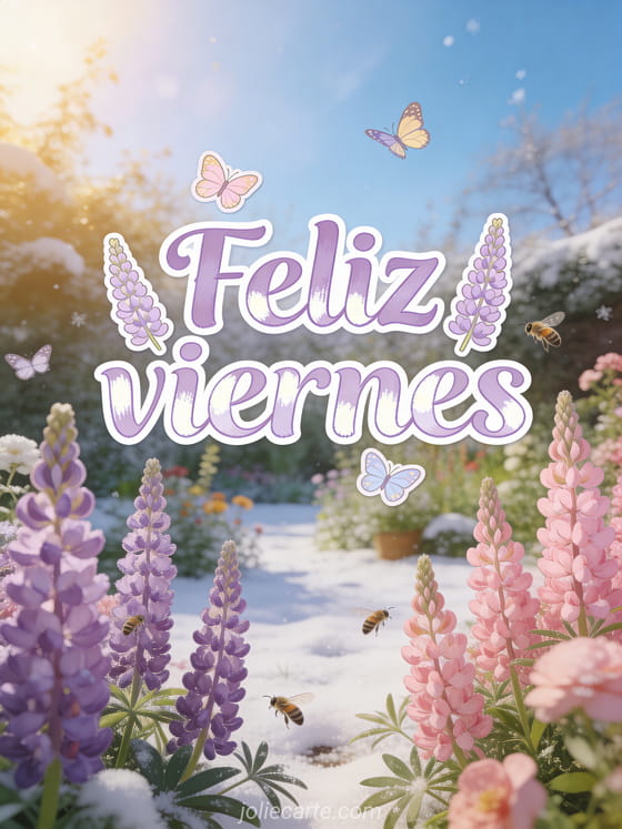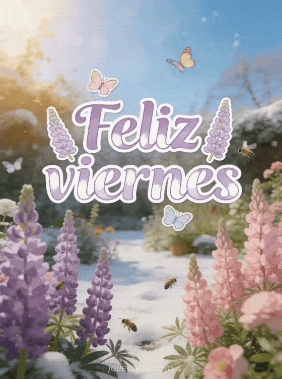 Desea un feliz viernes con un jardín campestre lleno de color, lupinos en flor, mariposas pastel, abejas y luz dorada. Descubre también un feliz viernes humor gif, un muy feliz viernes o un buenos días buen día de viernes besos.
