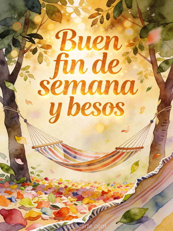 Comparte un saludo suave de fin de semana lleno de cariño, con una hamaca en acuarela, árboles frondosos y pétalos coloridos. También pueden enviar una buen fin de semana besos imagen, unos feliz fin de semana besos animados o una feliz fin de semana besos foto para alegrar el descanso.