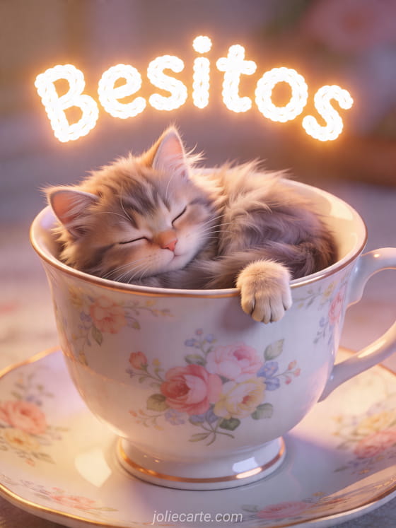 Comparta un dulce mensaje de besitos con esta adorable tarjeta que muestra un pequeño gatito Maine Coon dormido dentro de una gran taza de porcelana floral. También puede descubrir besos mi corazón gif, besos ai gratis o besos de amor pareja.