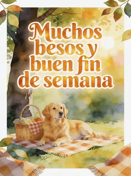 Desea un fin de semana alegre con letras juguetonas, un perro golden retriever bajo un árbol soleado, una cesta de picnic y una manta a cuadros. Descubran también gif feliz fin de semana muchos besos, feliz fin de semana mariposa besos o gif besos feliz fin de semana.